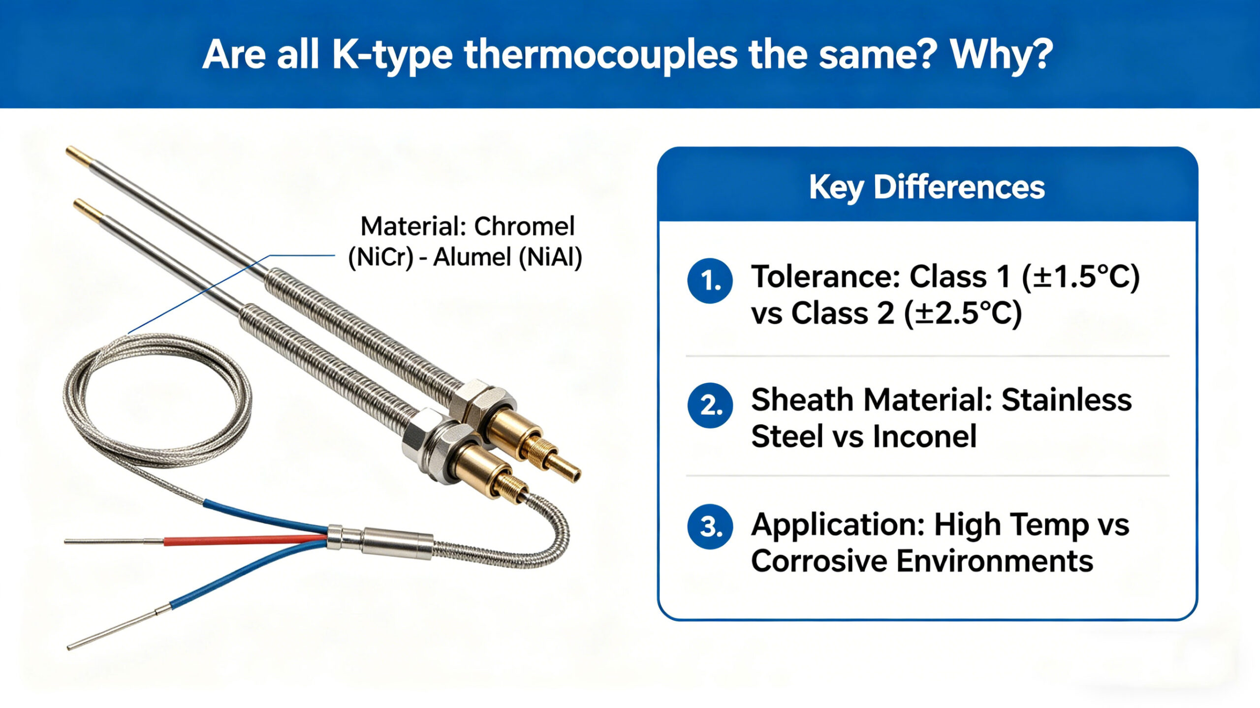Although they are all called “K-type” (meaning they share the same nickel‑chromium / nickel‑silicon alloy material system), in real‑world applications they differ greatly in accuracy class, sheath structure, material details, application environment, and calibration standards.